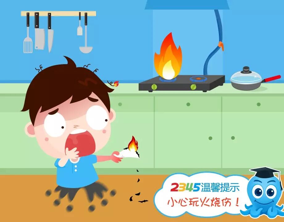 厨房里的灶台不要随意靠近,烧着火的灶台更是要远离,千万不要去玩火哦,小心被火烧伤!
