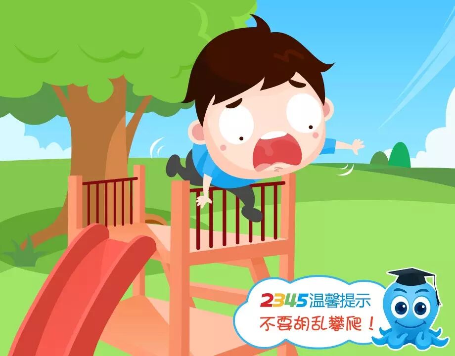 公园里的健身器材和儿童娱乐设备要正确使用,乱攀乱爬是非常危险的行为哦!