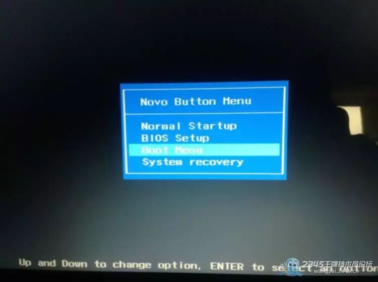 这是关机状态下按一键还原按钮(电源按钮旁边)会出来的画面。如果要修改BIOS设置,就选BIOS SETUP选项,回车就会重启进BIOS界面。