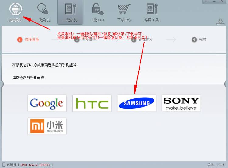 特点:一键刷机/解锁/修复/解权限/下载均可。完美刷机最好用在于它的一键修复功能,尤其是三星。